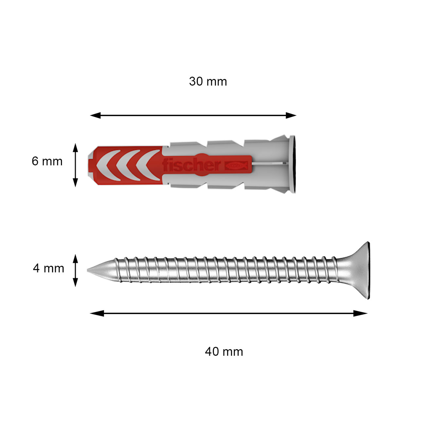 5 DUOPOWER Universaldübel von Fischer, Schrauben sowie Befestigungsclips mit 3-fach Nut. Diese Clips bieten mehrere Einrastmöglichkeiten und gleichen Unebenheiten der Wand aus, wodurch eine spannungsfreie Montage und ein sicherer Halt gewährleistet sind. Geeignet für verschiedene Untergründe wie Beton oder Rigips.