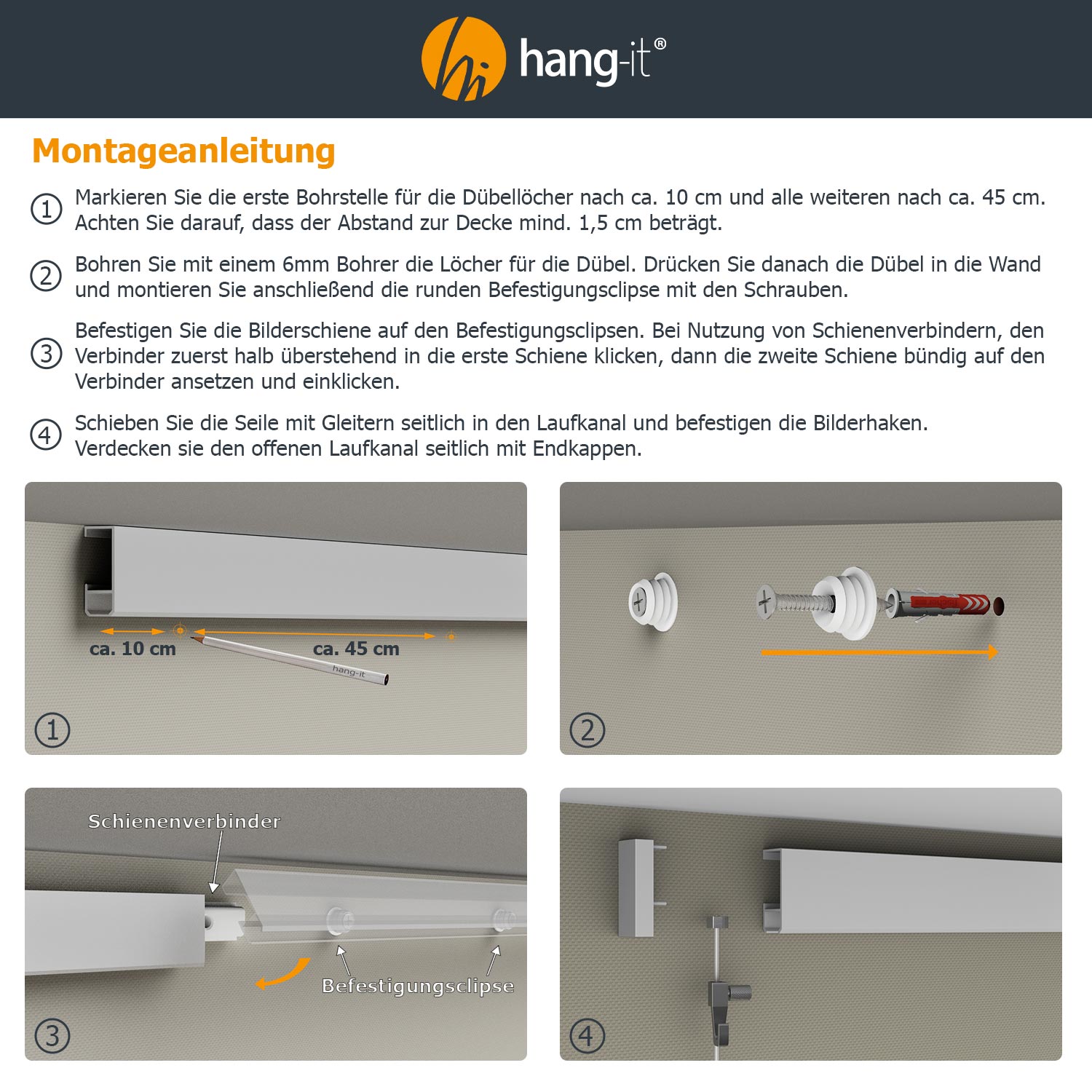 Mit der beiliegenden Montageanleitung gelingt die Anbringung des Galerieschiensystems leicht und schnell. Und wenn Sie Platz für weitere Bilder benötigen, können Sie das System jederzeit problemlos erweitern.