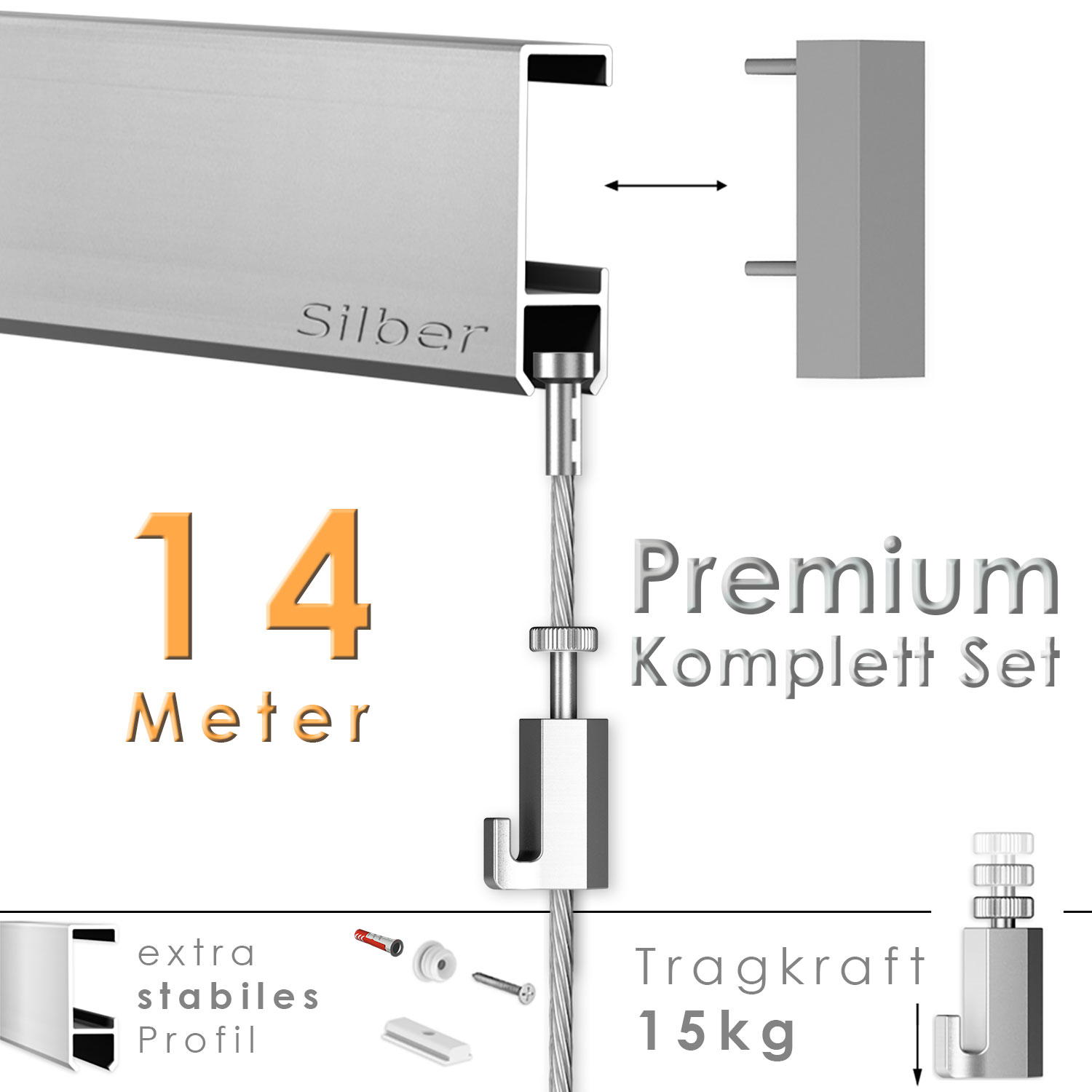 14 Meter Premium Set - Bilderschienen - Galerieschienen - Komplett Set in silber