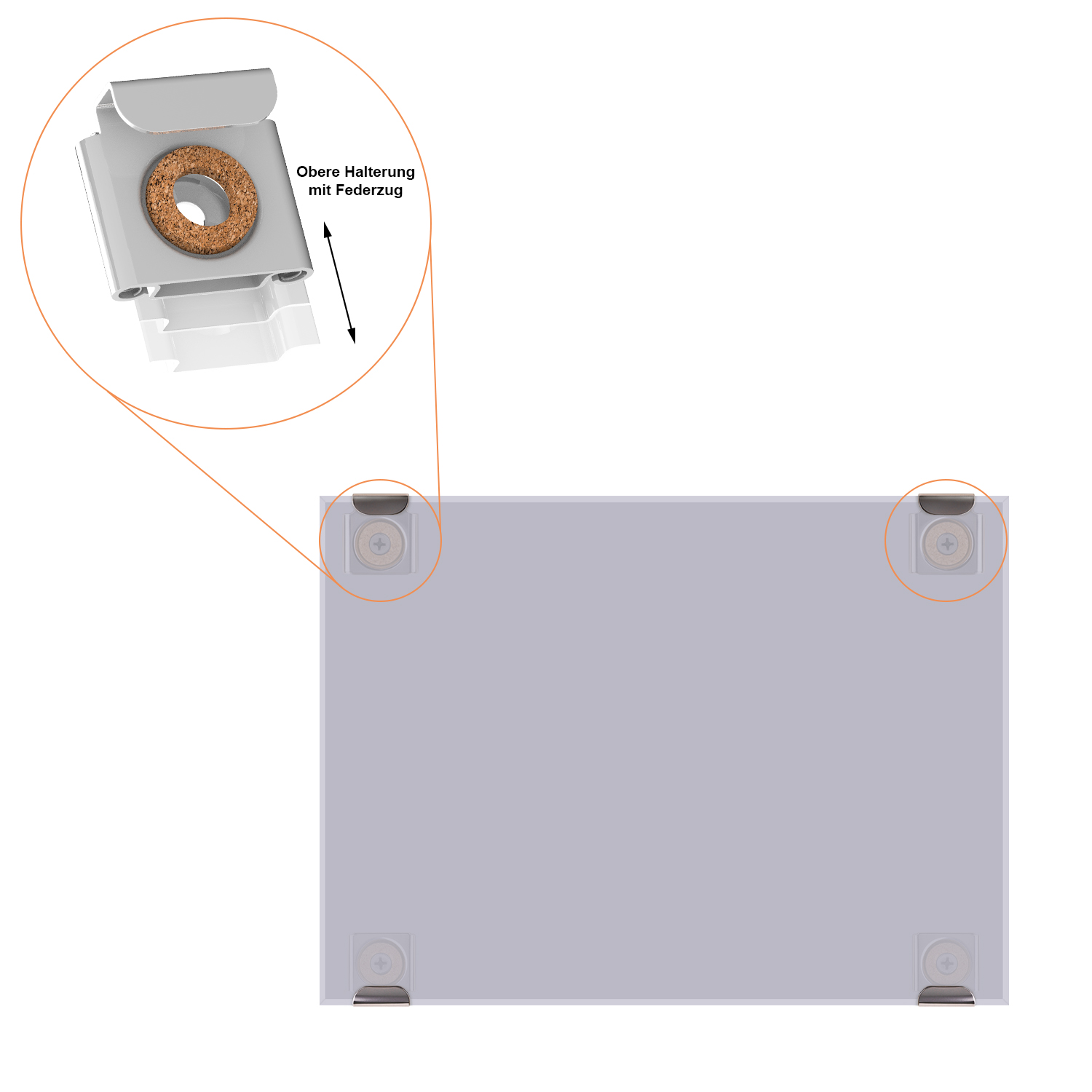 - Spiegel oder Platte leicht schräg nach oben in die oberen Spiegelklammern drücken, sodass der Federzug nachgibt und die Klammern sich nach oben schieben.