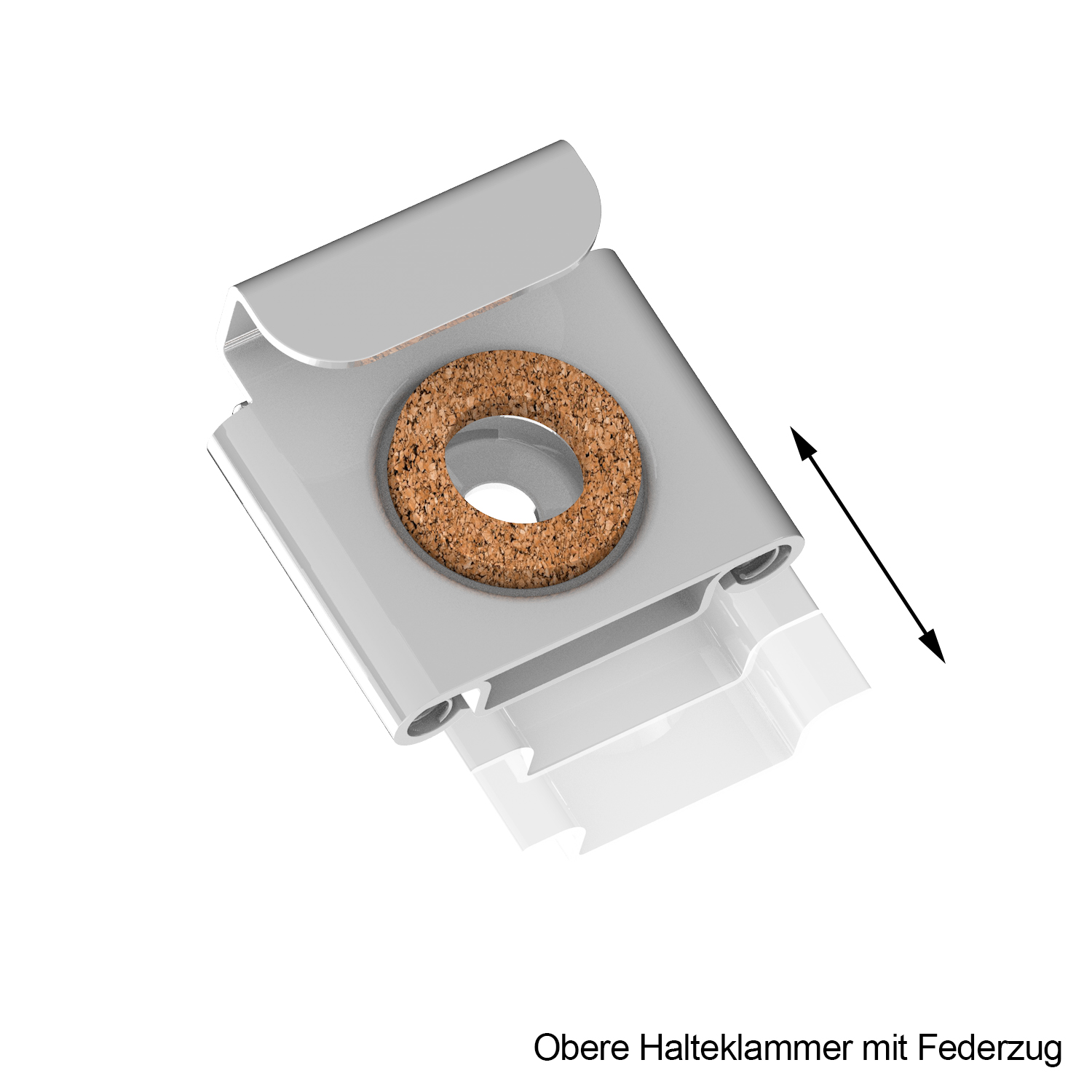 Das Set besteht aus zwei unteren Trageklammern sowie zwei oberen Halterklammern mit Federzug. Der integrierte Federmechanismus ermöglicht ein leichtes Einsetzen und automatisches Fixieren des Materials. Dadurch lassen sich Spiegel, Bilder oder Platten jederzeit einfach austauschen, ohne die Wandhalterung lösen zu müssen.